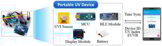 Therefore, the present study proposes a UVI sensor-based portable device implemented with the natural light’s EUVB ratio to support users’ safe exposure to sunlight. The proposed device is designed in a portable device form for easy portability and it is linked with a smartphone application to inform users whether the daily advised amount of outdoor activity has been met. In order to achieve this, the portable UV measurement device comprises a UVI sensor measuring the total UVI, a Bluetooth Low Energy (BLE) module that supports wireless communication with the smartphone application, a micro controller unit (MCU, Arduino, Italy) for performing operations with the raw values acquired from the sensor, a display module offering the measured UV information visually, and a rechargeable battery module for supplying power. In addition, it is equipped with the monthly/hourly EUVB ratio index, which helps to calculate the EUVB through the UVI values in the MCU. For the improvement of the measurement performance of the device, it goes through the correction process using special measuring equipment, i.e., a spectrometer (CAS 140 CT, Instrument Systems, Munich, Germany). Later, the proposed device’s measurement performance and effectiveness are verified through the actual measurement test between the proposed device and the standard device. By providing the UVI and EUVB information surrounding the user, hopefully, the proposed device will support the users with healthy outdoor activities through preventing potential damage from their exposure to UV.