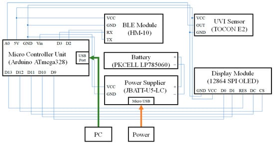 Figure 4 shows the circuit diagram of the UV portable device. The MCU was directly connected to a PC and firmware upgrade was performed via RS232C communication. Five V power was applied to the UVI sensor, whereas 3.3 V power was applied to the BLE module. The output value of the UV sensor was connected to the analog pin of the MCU and the RX, TX pins of the BLE module were connected to the digital pins of the MCU to send data. The display module received data with the MCU via SPI communication. Since the SPI communication requires Serial Clock (SCK), Master Out Slave In (MOSI), Reset (RST), Data/Command (DC), and Chip Select (CS), each of the signals was connected with each of the five digital terminals of the MCU. The + pole of the rechargeable battery module was connected to the Vin pin of the MCU to supply power to the MCU while the − pole was connected to the GND pin.