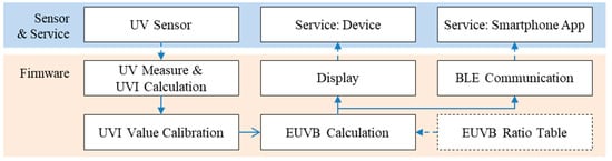 The firmware implements the calculation and adjustment of the UVI based on the values measured through the sensor and the calculation of the EUVB based on the monthly/hourly EUVB ratio index. It also offers UV information via the display module as well as the communication support for connecting with a smartphone. Figure 5 shows the main process flow of the firmware.
