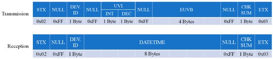 The communication was divided into the reception protocol and the transmission protocol, each of which comprised 14 bytes. The 1 byte at the beginning and the end of the packet comprised STX (0x02) and ETX (0x03), respectively, and each packet contained the device serial number (DEV_ID) and checksum (CHKSUM). The transmission protocol packet included the 2 bytes of the UVI value measured through the UV sensor and 4 bytes of the EUVB value calculated by the monthly/hourly EUVB ratio. The upper 1 byte of the UVI data was the integer part of the UVI value that had been converted and corrected, while the lower 1 byte was the floating value. The reception protocol packet included 8 bytes of the date and time for the synchronization of the time on the portable UV device via the smartphone. The checksum, which is a value used to check the effectiveness of the transmission and reception packet, was derived by performing XOR calculation by 1 byte starting from the 3rd byte to 11th byte of the packet.