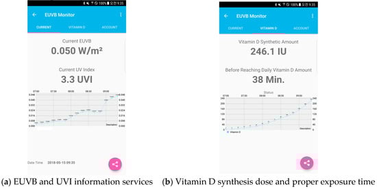 Recently, portable small UV devices have been released in the market. An accessory using a UVI sensor or a band type portable UV-measuring device has been developed [], and studies have been carried out to apply UVA and UVB sensors together to provide various types of UV-related information []. However, though these devices provided users with a UV index value, UVA or UVB values did not provide the EUVB information needed to calculate the amount of vitamin D in the body. Sundroid has provided the UVI through a smartphone application by measuring each radiation using the UVA sensor and UVB sensor and then applying the ratio of the EUVA and EUVB based on the pre-calculated erythemal weight []. However, this method does not consider the ratio of UVA and UVB changed by season and hour; thus, it is limited in offering accurate real-time based UV information. Another study has focused on a UVI and Particulate Matter alert service that uses both the user-measured values and the real-time UV information provided by meteorological agencies to enhance the accuracy of real-time information []. However, due to the limitations of the small UV sensors, this service could not offer EUV-related information to which the erythemal weight is applied. As such, existing UV information services have provided limited services on UVI values and corresponding outdoor activities without providing any EUVB information closely related to human health. Furthermore, these services do not offer real-time UV and EUVB information reflecting each user’s period of activity and regional characteristics.