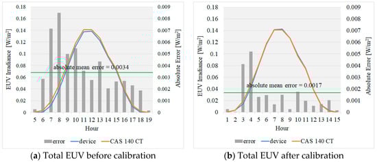 Later, Equation (9) was used to correct the EUV. Figure 8 shows the EUV graphs before and after the use of the correction equation. The correction result showed 0.0017 W/m2 of mean error, indicating that the correction equation could reduce the error by over 50%.