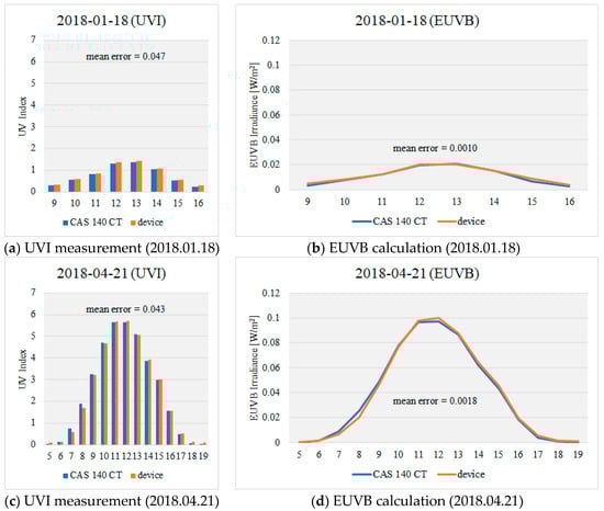 In order to evaluate the measurement performance of EUVB, the measured results of EUVB and the portable UV device based on the measured results of the spectrometer (CAS 140 CT) were compared. In order to evaluate the measurement performance, natural light was measured after selecting each day of spring with relatively high ultraviolet intensity, and winter with relatively low ultraviolet intensity. Figure 9 shows the results of EUVB using the measured results of each seasonal UVI and the EUVB ratio indicator. The UVI measurement result showed an average difference of 0.045 compared to the reference instrument (CAS 140CT), showing that it coincided until the second digit below the decimal point. The EUVB calculated by the proposed method showed errors of 0.0010 and 0.0018 W/m2 in spring and winter, respectively. The average error of EUVB is 0.0014W/m2, which corresponds to 1% when compared with the maximum EUVB size (0.17W/m2) in the immediately preceding year within the region. Therefore, it is confirmed that accurate EUVB information can be provided and put to practical use with the proposed device.