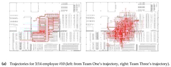 Figure 14 and Figure 15 show the examples of submitted results from the participants for the PDR and VDR tracks. As shown in the figures, most of the participants could estimate the positions of the targets by localization methods based on PDR or VDR during the BUPs when the BLE signals were intentionally deleted. In Figure 14, the efforts for avoiding the obstacle interference and online calibration using straight lines can be seen. Most of the line directions were horizontal and vertical, and trajectories existed mainly in the aisles of the warehouse. In Figure 15, it can be seen that the forklifts were driven only on the wide aisles that were mainly located on the outer area. Such trajectory types can be seen in the submitted results on the VDR tracks.