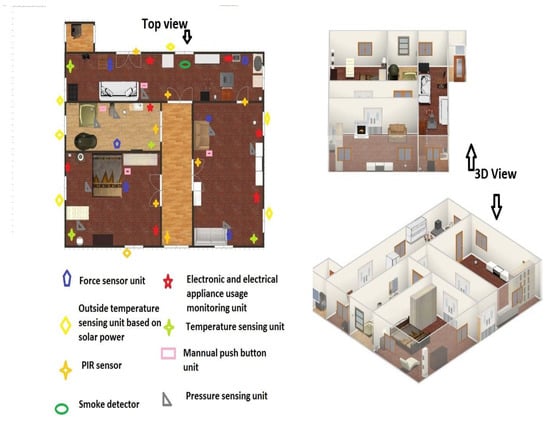 The crude sensor activations from sensors (not the sensing unit) are communicated to the baseboard Microcomputer for competent sampling and transmission controller algorithm. The present algorithm analyzes the sensor activations in advance, followed by being applied to Wellness packet encapsulation algorithm. The sampling-transmission control algorithm and packet encapsulation algorithm perform excess data reduction. These algorithms do it through categorization and detection of unavoidable sensor activation from indispensable sensor activation at the sensing unit level before it is communicated to the server. The outline of the AAL environment with sensor positioning is displayed in Figure 3. The sensors are positioned in such a style so that the system gets each indispensable sensor activation commencing in the household, which is valid to the well-being investigation of an elderly inhabitant.
