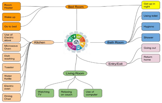 One imperative idea in AAL is the recognition of ADLs. The idea of ADLs is generally utilized in healthcare, abridging exercises and day by day schedules, on which the wellbeing status of an individual is based, and, at last, on which the capacity of an individual to live freely in a network is evaluated. To live independently, an inhabitant is supposed to perform daily activity sets, which include sleeping, bathing, cleaning, eating, entertainment, cooking, dressing, drinking, walking, and taking medication (if one needs). To monitor the set of activities for a lone-living individual, different methodologies have been developed to generate ADL patterns by smart home scientists. ADL modeling is a complex task in the endeavor of smart aging research due to the unique characteristics of activities in the indoor environment. On one side, an assortment of variables ought to be mulled over to portray a sub-activity or activity, for example, localization, the physical article associated with the location, and timestamp [12,16]. These characteristics may change after some time, which makes the ADL recognition increasingly troublesome.