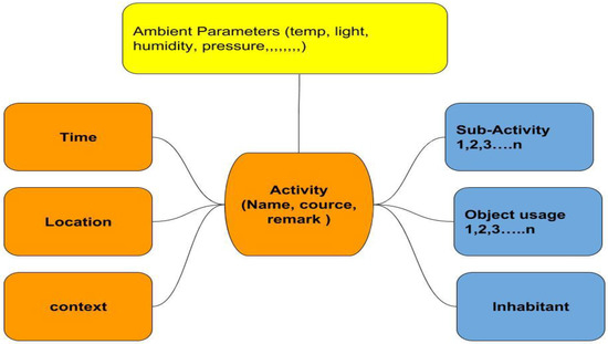 The appropriateness of activity monitoring for wellbeing status in the smart aging environment has additionally been investigated from the point of view of function with the group of various data sources. McAvoy et al. [12] developed a higher level context framework for indoor monitoring, which covered more or less all significant context-based aspects, such as subject, household object, localization, sub-activity, and time-based features, in a rational and steady style. Zhang et al. [13] offered a method, which considered distributed context conceptions and innovative time-based cognitive aptitudes equally to generate ADL patterns in the AAL. Okeyo et al. [14] proposed an ontological method, which recognized relations between activities and their associated units, and time-based ADL modeling, which introduced relationships among the principal activities of a compound sub-activity.