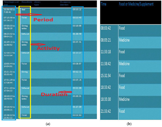 A web-based Intelligent Aging framework had been produced. The data was gathered and treated through sensor data fusion calculations for the decision making. At last, data was transferred to the web link; the data over the internet was opened to a validated client by means of enlisted email id and secret word. The initial ADL recognition was completed by the heterogeneous sensor network; the push button indicator data did not apply. Nonetheless, there are a couple of exercises that the framework does not recognize effectively, for example, taking supper or pharmaceuticals on time. For this sort of exercises, either of the frameworks utilize prominent checking routes, for example, camera, wearable sensors, or go with a parental figure every minute of every day, which isn’t attainable and economical [4,5]. Moreover, in the current investigation, the push button indicator information was applied to crosscheck the ADLs produced via the information secured from diverse sensing units. Figure 9a,b indicate previews in the Wellness framework website. This site comprises the information of recent ADLs. In order to check the observing historical ADLs from a specific date, the subject needs to choose a date and time. Figure 9a demonstrates the data on the non-electrical machine use. It demonstrates resting, eating, and latrine exercises: for instance, on August 30, a tenant went to the toilet in the morning for 00:10:43 (hours:minute:seconds). Figure 9b displays the observing of nourishment and medication of a tenant. It shows that the inhabitant was taking a drug soon after the food and daily three events of medication were recorded.