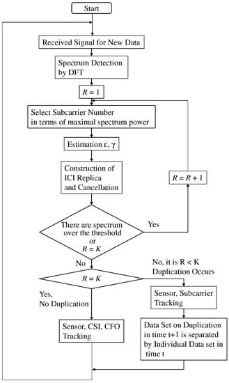 We define the protocol, which is the selection of subcarrier in terms of maximal power criterion, the estimation of CSI and CFO, and the cancellation by constructed ICI replica as the iterative protocol. After the iterative protocol, FC can detect the subcarrier with power exceeding a certain threshold. If it is true, the iterative protocol is performed again and then comparison between the power of subcarrier and the certain threshold is conducted. Otherwise, it is stopped. If the number of constructed ICI replicas during the iterative protocols is equal to the number of sensors, K, the duplication of sensing results does not occur. Otherwise, it occurs.