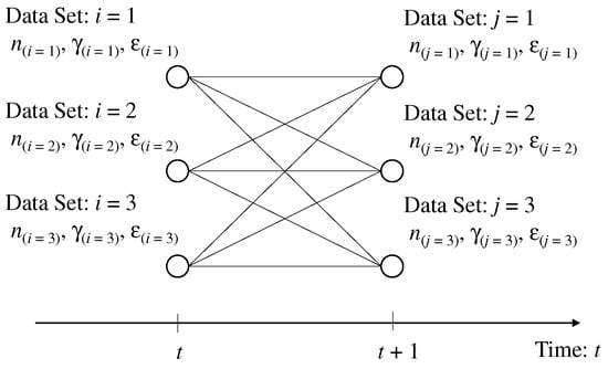 We assume certain sensors, or all the sensors take common sensing result. Figure 4 shows the image of the data set in the tth and th time slots. We define the sensors taking the sensing result in the jth data set as the sensor group of , where is the integer field and is the number of sensors taking the sensing data in jth data set.