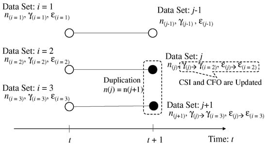 After deciding the connection between the data sets, the data set in th time slot connected to multiple data set in tth time slot requires the update of CSI and CFO because the individual CSI and CFO are not obtained due to large interference. In the proposed separation, the data set connected to multiple data sets is divided into the individual data set using that in tth time slot. Figure 5 shows the image of dividing the data set in th time slots. Although the sensing results are common for the divided data set, the CFO and the CSI of the data set in th time slot are overwritten by the CFO and the CSI of data in tth time slot. Therefore, the number of data sets in slots is increased, and it is equal to K. Owing to this, the subsequent data tracking from th time slot to th time slot can use the individual data set of each sensor and thus the protocol of data separation is continued.