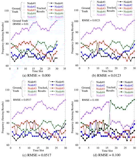 where is the sensing result detected by FC and is the true sensing result. Root mean square error (RMSE) is averaged for all the trials and all the sensors and thus the average RMSE is derived. Figure 6 shows the snap shot of the separation results. The ground truth and the tracked result are the original sensing result and the result separated by tracking, respectively. We can observe in RMSE = 0.0123, the separation error is limited but if RMSE exceeds 0.0123, the burst separation errors occur, and these are error tracking. Therefore, our required RMSE is approximately 0.01.