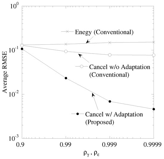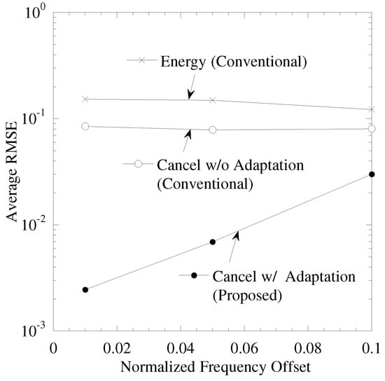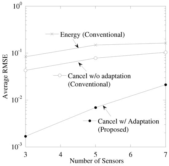 Figure 8 shows the performance between the time correlation of CSI and CFO, , and the average RMSE, where the time correlation of CSI is equal to that of CFO, . The number of sensor nodes, K, is 5. The maximal CFO, , is 0.05. In “Cancel w/o Adaptation”, the improvement of RMSE is limited. This is because the duplication of sensing results causes the misunderstanding of sensor node and thus the error tracking causes the degradation of RMSE. “Cancel w/ Adaptation” is the best performance. As becomes larger, the RMSE of “Cancel w/ Adaptation” is improved. Owing to the high time continuity of CSI and CFO, the accuracy of data tracking is improved. In addition, the tracking with received spectrum aids in avoiding the error tracking.
