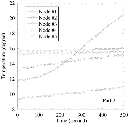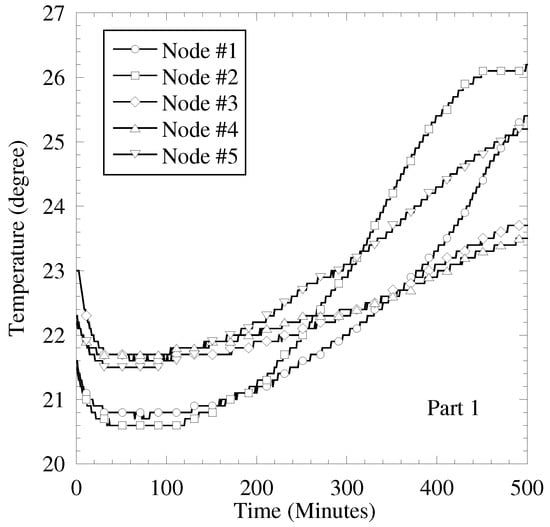 In this subsection, the sensing results obtained by the actual sensors are used for the sensing result in computer simulation. The purpose of performance evaluation is clarifying the accuracy of sensing result separation by proposed scheme in applying to the actual sensing results. We use two temperature sensing results. First one is as follows. Figure 10 and Figure 11 show the images of experimental evaluation and the obtained sensing results, respectively. In this experimental evaluation, the temperature sensor is used and the number of sensors, K, is 5. Every 1 minute, each sensor evaluates the temperature from 4 am to 1 pm in the last ten days of April. Since an automatic air conditioner is stopped, the cause of changing temperature is a climate shift, such as sunshine condition, wind condition, and so on. Figure 12 shows the obtained temperature results in the second situation and this test sensing results are given in []. Every 1 second, each sensor evaluates the temperature during 500 s in the end of November. We start working a heater after 150 s from start time. The other detail conditions are shown in []. In the first result, the impact of sunny and wind conditions to sensor is mild and the sensing results are almost commonly changed. The time correlation and the correlation among sensors are high. In the second result, a heater makes the temperature enlarged. Especially, the nearer to the heater the sensor is, the more significant the increment of temperature is. Therefore, the difference of temperature among sensor is larger in the second result than that in the first result.