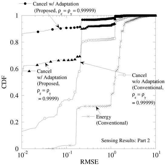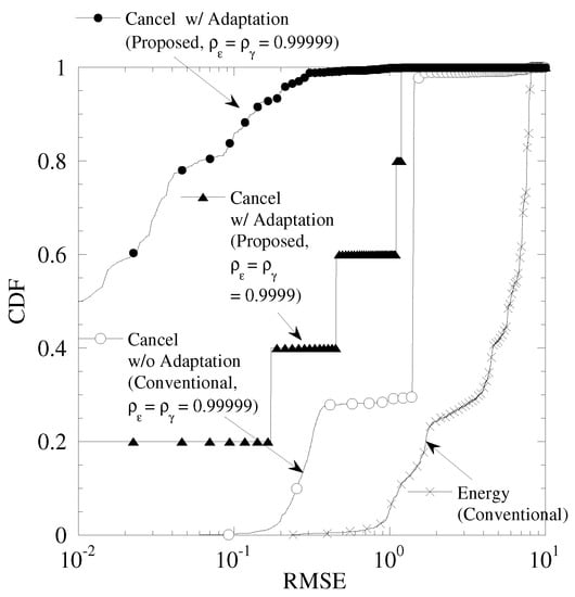 Figure 13 shows the cumulative distribution function (CDF) of RMSE in the sensing results of Figure 11. From this figure, “Cancel w/ Adaptation” achieves the minimum RMSE among all the results. As and are changed from 0.999999 to 0.99999, the RMSE is degraded. The temperature sensor has the high correlation among sensors. Therefore, each sensing result takes the similar value. As a result, in the detection by FC, the duplication of sensing results frequency occurs. In the proposed technique, the data set is updated from the past data set. If the updating of the data set continues for long time slots, the mismatch of the detected CSI, CFO, frequency spectrum between detecting data set and past one becomes larger. Therefore, the high time correlation of CSI and CFO are required for achieving smaller RMSE.