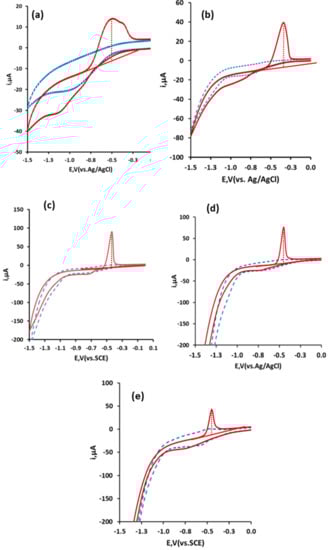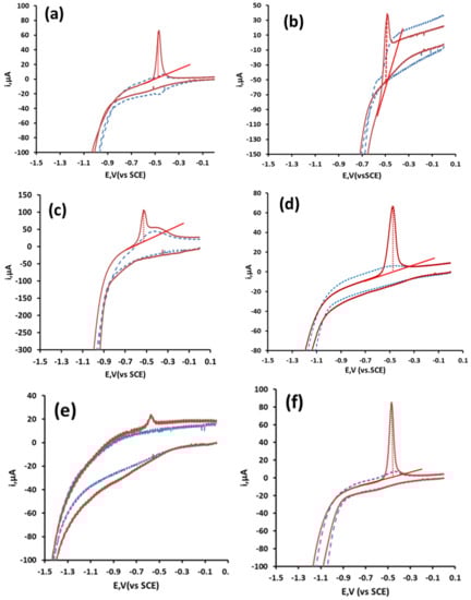 Effect of supporting electrolyte on the cyclic voltammetric behavior of Pb. (a) Ortho-phosphoric acid, (b) nitric acid, (c) hydrochloric acid, (d) acetic acid, (e) potassium chloride and (f) malonic acid. Blue dashed line in the absence, and red solid line in the presence of 116 µM Pb.