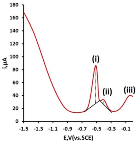 In previous studies of carbon electrodes, it has been shown that multiple stripping peaks can be recorded for Pb [17] and other metals [16]. This arises from the heterogeneous nature of the electrode surface. As a result, metal ions were deposited on the electrode surface not as a continuous layer but as islands, mono, or multiple layers with differing affinities to the surface. This was consequently reflected in the stripping step, where these different affinities for the electrode surface required different applied potentials to be removed (stripped) from the surface. As can be seen in Figure 4, the CRE showed very similar behavior to that previously reported at other carbon electrodes [17]. Three stripping peaks, which have been denoted as (i), (ii) and (iii), were recorded, with Ep values of −0.57 V, −0.44 V and −0.05 V, respectively.