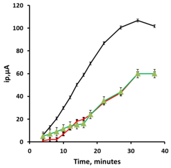 Figure 6 shows the relationship for the peak current (ip) values of peaks (i), (ii) and (iii) for 4% v/v acetic acid solution containing 100 µg/L Pb. All three peaks were found to increase in magnitude with increasing time and to plateau after 30 min for a 100 µg/L Pb2+ solution. Peak currents for all three anodic Pb stripping peaks were found to increase linearly with time. Peak (i) exhibited a near linear relationship with time for up to 20 min (76.6 nA/s, R2 = 0.999), becoming independent of time beyond this point.