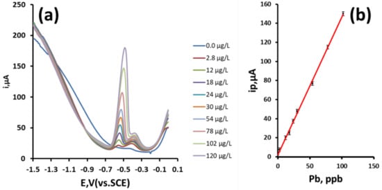 Figure 7 shows the DPASVs obtained in 4% acetic acid from 2.8 µg/L to 120 µg/L Pb. Utilizing peak (i) and an accumulation time of 1100 s with forced convection at an applied potential of −1.5 V (SCE), a linear relationship with Pb2+ concentration and ip was obtained from 2.8 µg/L to 110 µg/L (R2 = 0.999, 1.45 µA/ng/mL). Based on a signal–to–noise ratio of three (3σ), a theoretical detection limit of 2.8 µg/L was calculated.