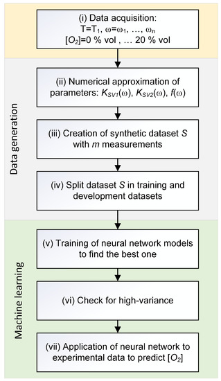 The best-performing network was identified through the study of different architectures and hyperparameter tuning. The trained network was then applied to experimental data, to check its generalization capacity when applied to unseen data. The analysis of the error in the prediction of the oxygen concentrations showed that it was due to the synthetic training data, which were calculated with an approximate analytical model. Using for the training dataset experimental data would therefore reduce the absolute error that can be achieved with this approach. The present study showed that, while the concept as implemented already achieves results comparable with many high-concentration (up to air concentration) commercial sensors and compact sensors based on the classical approaches [6,14], there is still the potential to improve its accuracy. The advantage of the proposed approach is that the analytical model, and therefore its complexity, do not play a role. As long as enough data are available to train the neural network, it will be able to the learn dependence of the oxygen concentration from all parameters.