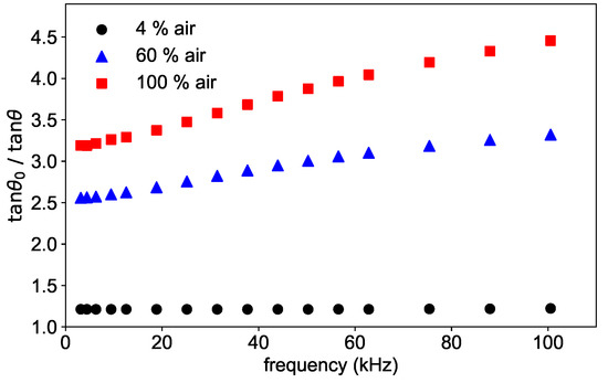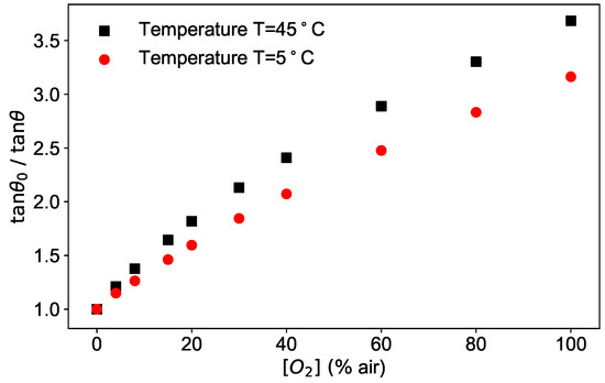 The frequency dependence of the phase shift is shown in Figure 4 for three different concentrations for a fixed temperature of 45 °C. As can be seen in the figure, the ratio / shows a frequency dependence, which is stronger the higher the concentration is. This dependence is due to the oversimplification of Equation (3), which is approximately correct in the absence of oxygen, and therefore without quenching, but does not hold for higher concentrations.
