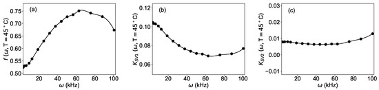 Dependence of the parameters of Equation (4) from the angular frequency of the modulation: (a) , (b) , (c) . Dots: result of the fit of the experimental data; solid line: spline approximation used to generate the synthetic data.