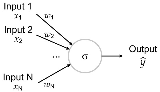 A schematically depicted neuron. It applies a non-linear transformation to the inputs with the sigmoid activation function to obtain its output.