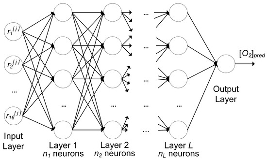 Architecture of the feed-forward neural network with L layers, each having a number of neurons . is the ith feature of the th observation; the output is the predicted oxygen concentration .
