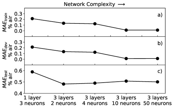 As expected, the values of all three MAE are larger for neural networks with lower effective complexity, on the left of the plot, than for ones with higher complexity, on the right of the plot, regardless of the dataset to which the network is applied. This result reflects the fact that, if the network is not complex enough, it does not perform well since it cannot learn the subtleties of the data. In Figure 8a,b, it can be noted that the MAE and MAE have similar behavior and assume almost the same values, going to zero for increasing complexity. For the architectures studied in this work, both MAE and MAE reach a minimum of 0.012% air for the network with 3 layers and 50 neurons. The reason for the error going almost to zero is that both the training and development datasets contained synthetic data generated by the same function, therefore without any experimental noise. Typically, when training neural network models, it is important to check if we are in a so-called overfitting regime. The essence of overfitting is to have unknowingly extracted some of the residual variation (i.e., the noise or errors) as if that variation represented an underlying model structure [28]. In this work, with increasing complexity, the network will never go into such a regime, since the development dataset is a perfect representation of the training dataset. This leads to almost identical MAE and MAE error values, regardless of the network architecture effective complexity.