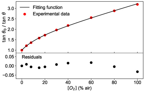 (top) Phase shift measured at a modulation frequency of 6 kHz and at the temperature of 45 °C for various values of oxygen concentration (circles). The line is the fit obtained with the Equation (4). (bottom) Residuals of the fit.