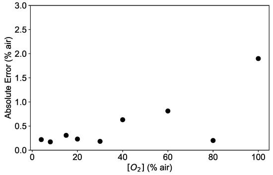 These results are supported by the analysis of the dependence of the absolute error AE on the oxygen concentration. As an example, the absolute error calculated as in Equation (9) is shown in Figure 10 for a network with 3 layers and 10 neurons. As shown in Figure 10, the AE is below 0.5% air for low oxygen concentrations, tends to increase with higher values and reaches its maximal value of 2% air at 100% air. This is consistent with the deviations shown in Figure 9, indicating that the fitting function works worst at 100% air.