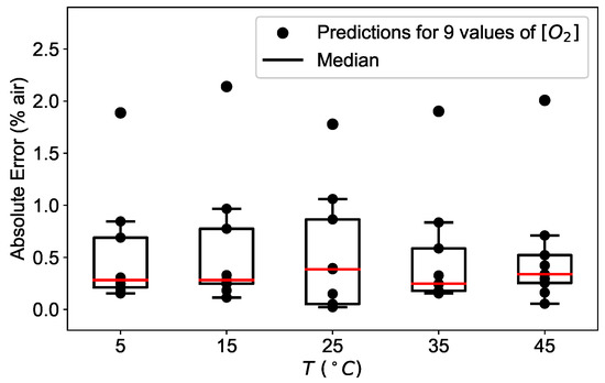 The above mentioned observations are valid at all temperatures studied, as shown in Figure 11. For each temperature, the absolute error is calculated for the available oxygen concentrations and displayed as a box plot, where the median is visible as a red line.