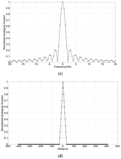Figure 1, (a) is a three-dimensional ambiguity function graph, (b) is the contour map corresponding to (a), and (c) and (d) are zero Doppler and zero shift sections. Obviously, the CCC has a “pushpin type” ambiguity function, similar to the Pseudo Random Code (PRN) sequences. This means that the CCC can provide a high resolution in distance and speed and a good sounding accuracy. It is very suitable for soft target sounding applications such as the ionospheric sounding described in this paper.