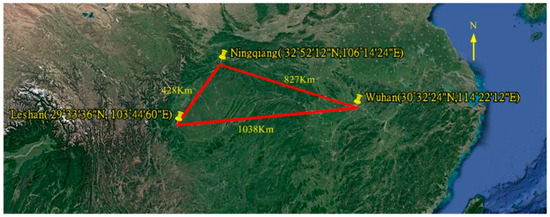 To confirm the practicality and application effect of this method, we conducted verification experiments between June and August 2018. In these experiments, we set three ionosondes with the same construction at Wuhan (30°32′24″ N, 114°21′12″ E), Leshan (29°33′36″ N, 103°44′60″ E) and Ningqiang (32°52′12″ N, 106°14′24″ E). The distribution of the stations is shown in