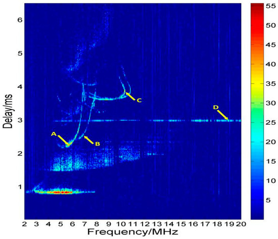 Figure 4 displays the ionograms recorded at 14:37 Beijing time (BJT) on 23 June 2018. As previously anticipated, the ionospheric information of multiple locations was obtained at the same time. The local vertical echoes of Ningqiang are distributed at 4–8 MHz. According to the delay time, we can calculate that the virtual height of Es layer in Ningqiang is about 126 km and that of F2 is about 326 km. The oblique signals transmitted by Wuhan and received by Ningqiang are distributed in the range of 7–11 MHz. The propagation distance of the signals reflected by the F2 layer of the propagation midpoints is about 1083 km and that of the Es layer is 891 km. According to the ground distance between Wuhan and Ningqiang, the virtual height of F2 layer and Es layer of the propagation midpoint can be calculated as 349 km and 165 km respectively.