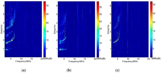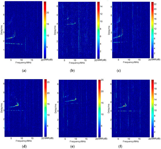 Figure 7 shows the oblique ionograms of each station by the decoding with the other stations’ CCC sequences. In the plots, (a) and (b) are the oblique ionograms based on the received signals of Leshan and decoded by the transmission sequences of Ningqiang and Wuhan. (c) and (d) are the decoded results of Ningqiang with the Leshan and Wuhan’s transmitting sequences respectively. (e) and (f) are the oblique ionograms of Wuhan station according to the code sequences of Leshan and Ningqiang. As seen in