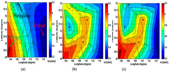 19], the inversion results of foF2 parameters are quite reliable. Referring to the vertical sounding results of the reflection point, 84.62% of the oblique inversion results are within the error of 0.4 MHz). In the plots, (a) is the map assimilated according to the data of the three vertical soundings, (b) is the map based on the data of the three oblique soundings, and (c) is the map involving both the vertical soundings and the oblique soundings. The black triangles are marked as the positions of the sounding stations, while the black circles are marked as the positions of the midpoints of the oblique sounding propagation paths.