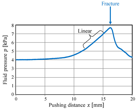 Following the linear behavior, the rate of increase in pressure behavior changed. Around mm (around the area where the pressure behavior ceased being linear), part of the left fingertip invaded the object body (see Figure 4). This invasion is a sign of a crack or fracture. Therefore, the grasping should be conducted before the linear behavior stops.