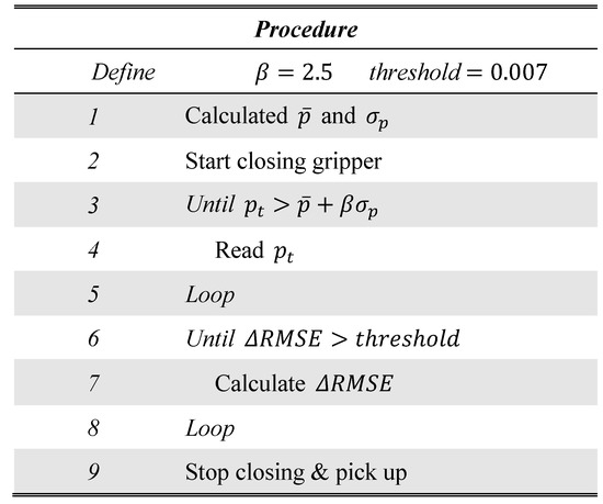Therefore, the CP is the preferable grasping point, and the preferred grasping methodology is to detect the CP, stop the compression, and pick up the object to be grasped. The subsequent section will present the methodology for detecting the CP.