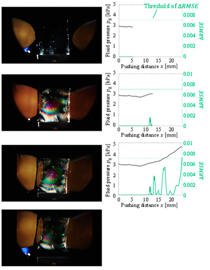 At first, the fluid fingertips invaded into the object (gelatin) and the rate of increase in pressure was extremely low. As the pushing distance (mm) increased, the internal stress spread out, as shown from the photoelastic images. Around the CP ( mm), the morphology or shape change in the stress distribution (the change in the positions and thicknesses of the color bands) became small, and deformation started around the free boundaries. The degree of invasion of the fluid fingertips became almost constant. The corresponding pressure behavior became close to linear (see Figure 3).