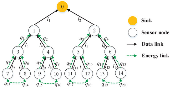 In the simulations, tree-based WSNs topologies are considered. Figure 2 shows the data and energy topologies in energy harvesting WSNs, which has one sink (i.e., ), 14 sensor nodes, 14 directed data links and 20 directed energy links. It is noted that each leaf sensor node only needs to transfer energy from its sibling neighboring sensor node; each parent sensor node needs to transfer energy from children sensor nodes in order to transmit successfully heavy sensing data from itself and children sensor nodes; and the sink node does not need to transfer energy since it is not energy-limited. Meanwhile, the half-duplex mode is adopted in the network system. In other words, there are only a few active links in a time slot. In Figure 1, we observe that there are five active links keeping simultaneous communication in the first time slot.