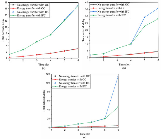 The total delay of energy harvesting WSNs over time: (a) Data flow ∼; (b) data flow ∼; (c) data flow ∼.