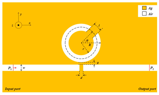 A schematic diagram of the designed waveguide structure is shown in Figure 1. The waveguide consisted of a CSRRC and the MIM waveguide with a baffle. For simplicity, we used a two-dimensional model. To ensure that only the fundamental transverse magnetic (TM0) mode was available [31], the width of the MIM waveguide and the CSRRC was fixed at w = 50 nm. The CSRRC was formed by splitting the complete ring. The length of the CSRRC split was represented by l and the direction of split was denoted by the angle θ between the center of the split and the x-axis. The inner and outer radii of the CSRRC resonator were r and R, respectively, and d and g denote the width of the baffle and the coupling gap size, respectively.