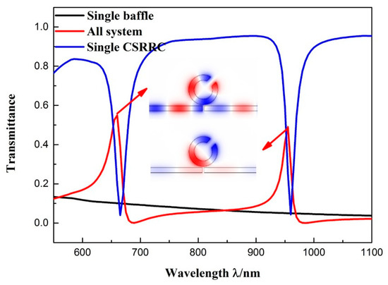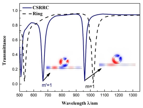 The other structural parameters were set as follows: R = 140 nm; = 45°; l = 70 nm; g = 10 nm. The transmission spectra of the entire system are shown in Figure 3. We can see that the system (red solid line) had a sharp asymmetrical linearity at λ = 955 nm and λ = 660 nm, which are typical Fano resonance phenomenon. This phenomenon is formed by the interaction of a broadband continuous state and a narrowband discrete state. For better illustration of the formation of Fano resonance, the entire structure could be divided into the following two structures: a MIM waveguide with baffle and an individual CSRRC resonator. The transmission profile of an isolated MIM waveguide with a baffle (solid black line) corresponds to the broadband continuous spectrum, which has a negative slope and a low transmittance. The transmission profile of the individual CSRRC resonator (solid blue line) has two narrow transmission dips, at λ = 665 nm and λ = 960 nm. Hence, we consider this as a narrowband discrete state. The two Fano resonances, at λ = 955 nm and λ = 660 nm, were aroused by the MIM waveguide with a baffle mode interacting with the symmetric mode of m = 1 and the asymmetric mode of m' = 1 of the CSRRC resonator, respectively. We indicate the first-order (λ = 955 nm) Fano resonances as Fano(1,1) mode and the second-order (λ = 660 nm) as Fano(2,1) mode [23]. Figure 3 shows their corresponding magnetic field distribution.