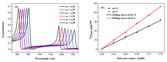 The Fano resonance was significantly affected by varying refractive indices of the dielectric because of its sharp and asymmetrical line shape [33]. Such a short wavelength change can generate an ultra-narrow transmission peak, which can significantly increase the sensing resolution. Therefore, we studied the sensing properties of the Fano system. Figure 5a shows the transmission spectrum of the structure at different refractive indices, where the refractive index varied from 1.24 to 1.39 RIU (at intervals of 0.03). The structural parameters of the waveguide were the same as that in Figure 3. It is observed from the figure that the two Fano resonances both exhibited obvious redshifts as the refractive index increased. The wavelength shift of the Fano resonance peak changed ∆λ as ∆n was increased, as shown in Figure 5b. The figure of merit (FOM) and the sensitivity (S) are two major parameters for assessing sensor performance. They are generally expressed as: