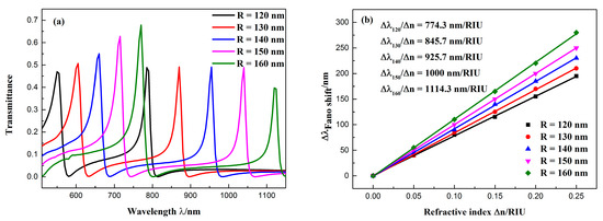 (a) Transmission spectra of the sensor at different CSRRC outer radii; (b) fitted line plot of the Fano(1,1) mode resonance peak shift (∆λ), changing with the increase of the refractive index (∆n).