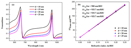 In addition, we also studied the effect of the silver baffle width on the transmission spectra. The baffle width d was varied from 10 to 25 nm in steps of 5 nm, while keeping the other parameters constant. The transmission spectrum obtained by the simulation is shown in Figure 7a. The following observations can be made from the figure: First, the change in the position of the peak was minimal because the field energy was mostly limited to the CSRRC resonator, this can be seen from Figure 3. Thus, the resonance wavelength primarily depends on the geometric parameters of the CSRRC resonator. Second, the line shape of the spectra changed as the width of the baffle increases. This is because the Fano resonance is formed by the interaction of a broadband continuous state and a narrowband discrete state. As the width of the baffle increases, the broad continuous spectrum produced by the isolated MIM waveguide with the baffle will change. This affects the outline of the Fano resonance. Therefore, when the baffle width was changed from 10 to 25 nm, the outline of the Fano resonance changed from being asymmetrical to nearly symmetrical. Figure 7b shows the resonance peak shifts of the Fano(1,1) mode with the refractive index changes Δn. The obtained sensitivity of the sensor system changed only slightly with the increase of d. Furthermore, FWHM became smaller; therefore, FOM got larger.