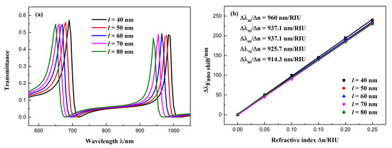 The other parameters were fixed at R = 140 nm, d = 20 nm, r = 90 nm, and the split length l of the CSRRC was changed from 40 to 80 nm (in intervals of 10 nm) to study the influence of CSRRC split length on the transmission spectrum. The simulation results for different split sizes are shown in Figure 8a. As the split length l increased, the Fano resonance peak had an obvious blue shift and the peak intensities of the resonance did not change significantly. Figure 8b shows the relationship of the resonance peak shift of the Fano(1,1) mode with the change in refractive index Δn. The fitting results show that the sensitivity of the sensing system was as high as 960 nm/RIU at l = 40 nm, and the FOM was 48.