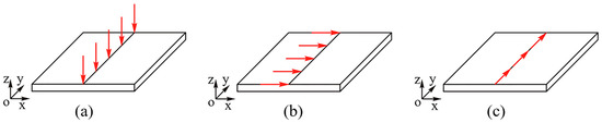 The junction between the transducer and the waveguide bar is called as the excitation source. The cross section of the bar with large aspect ratio can be taken as a line. That is to say, the excitation of the transducer for the bar is an approximate line loading. The line source loading types generally includes normal loading, tangential shear loading and anti-plane shear loading [25]. Different loadings show different excitation abilities, as shown in Figure 1.