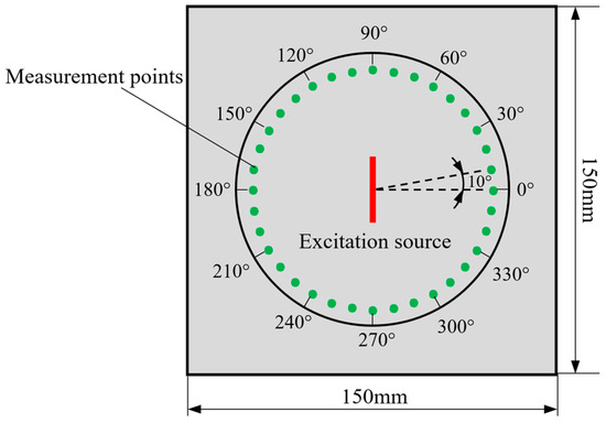 In order to select an appropriate loading to excite the non-dispersive SH0 wave, the finite element simulation of three loading types are carried out using ANSYS software. A 316L stainless steel rectangular plate is applied as a specimen. Its dimensions are 150 mm × 150 mm × 1 mm. The material parameters are Young’s modulus E = 195 GPa, Poisson’s ratio υ = 0.267 and density ρ = 2700 kg/m3. The line source lies in the middle of the plate and is supposed as a rectangle section in dimensions of 20 mm × 0.2 mm.The Plate is modeled using the Solid 164 element. The maximum size of the elements is 0.2 mm and the time step is selected as 0.05 μs. The excitation signal is a 5-cycle sinusoidal displacement tone burst modulated by a Hanning window and the center frequency fc is 1 MHz. The displacement load is applied according to the three loading conditions mentioned above, respectively. The displacement signals are measured at every 10° to obtain the distribution of the guided waves on the surface of the plate, as shown in Figure 2.